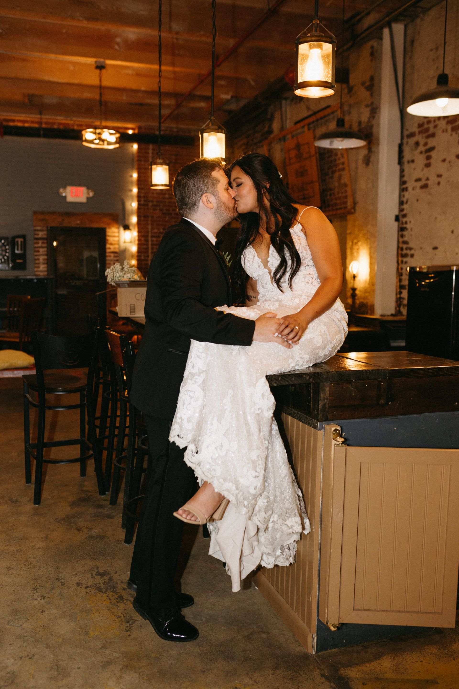 • A bride and groom are kissing in front of a brick wall.